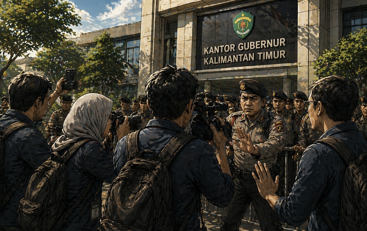 Di lokasi terpisah, tiga wartawan—Andi Asho (TV One), Rama Sihotang (Kaltim Post), dan Zulkifli Nurdin (Vonis.id)—sempat dihalangi saat meliput situasi di luar Kantor Gubernur yang merupakan ruang publik. Penghalangan ini menunjukkan adanya upaya membatasi akses informasi yang seharusnya terbuka bagi publik.
